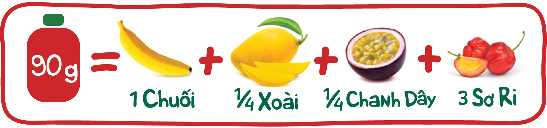 Chuối 45-50%, xoài 29-34%, chanh dây 8-13%, sơ ri, táo cô đặc.